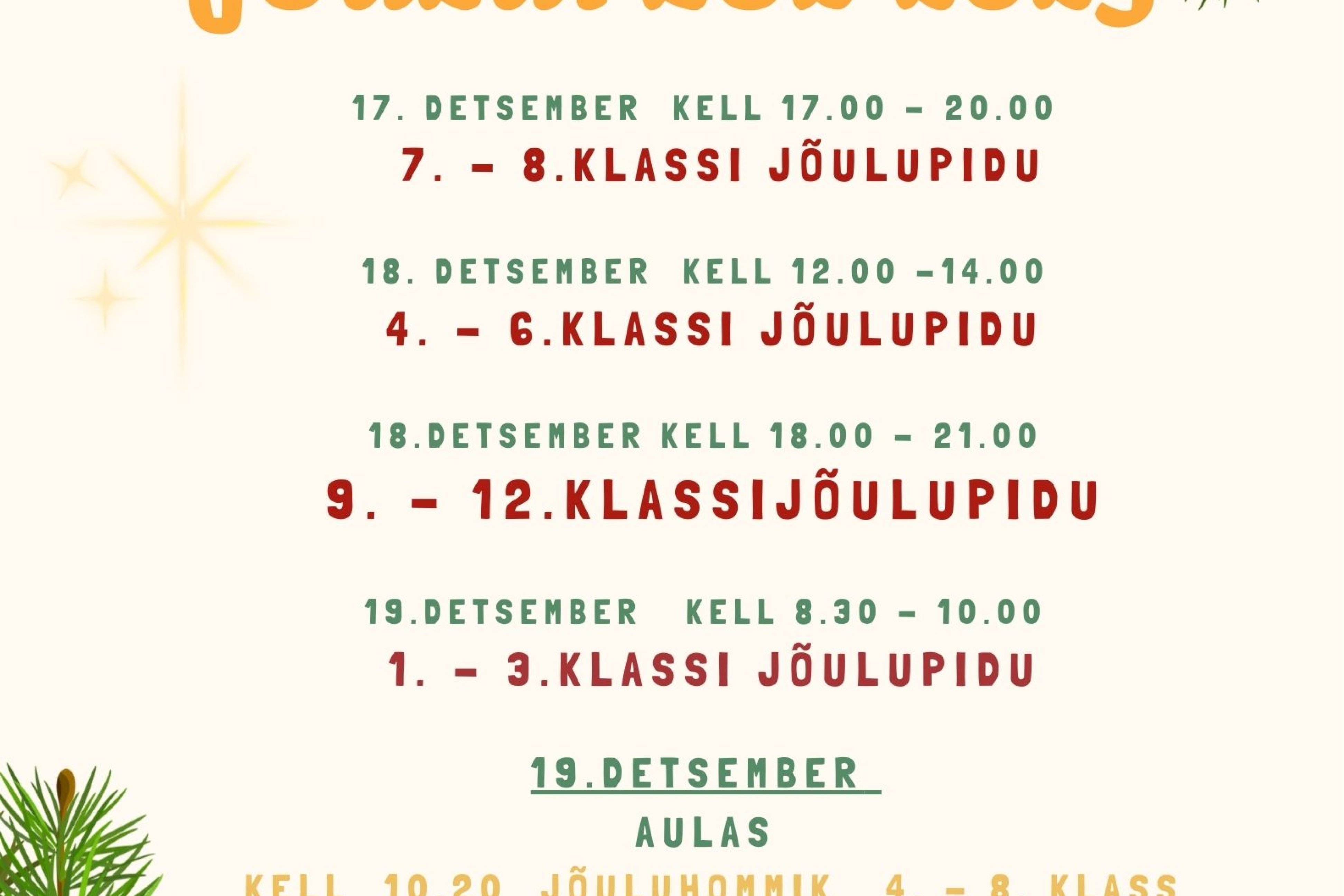 17. detsemberil kell 17:00 -20:00 toimub 7. - 8. klassi jõulupidu
