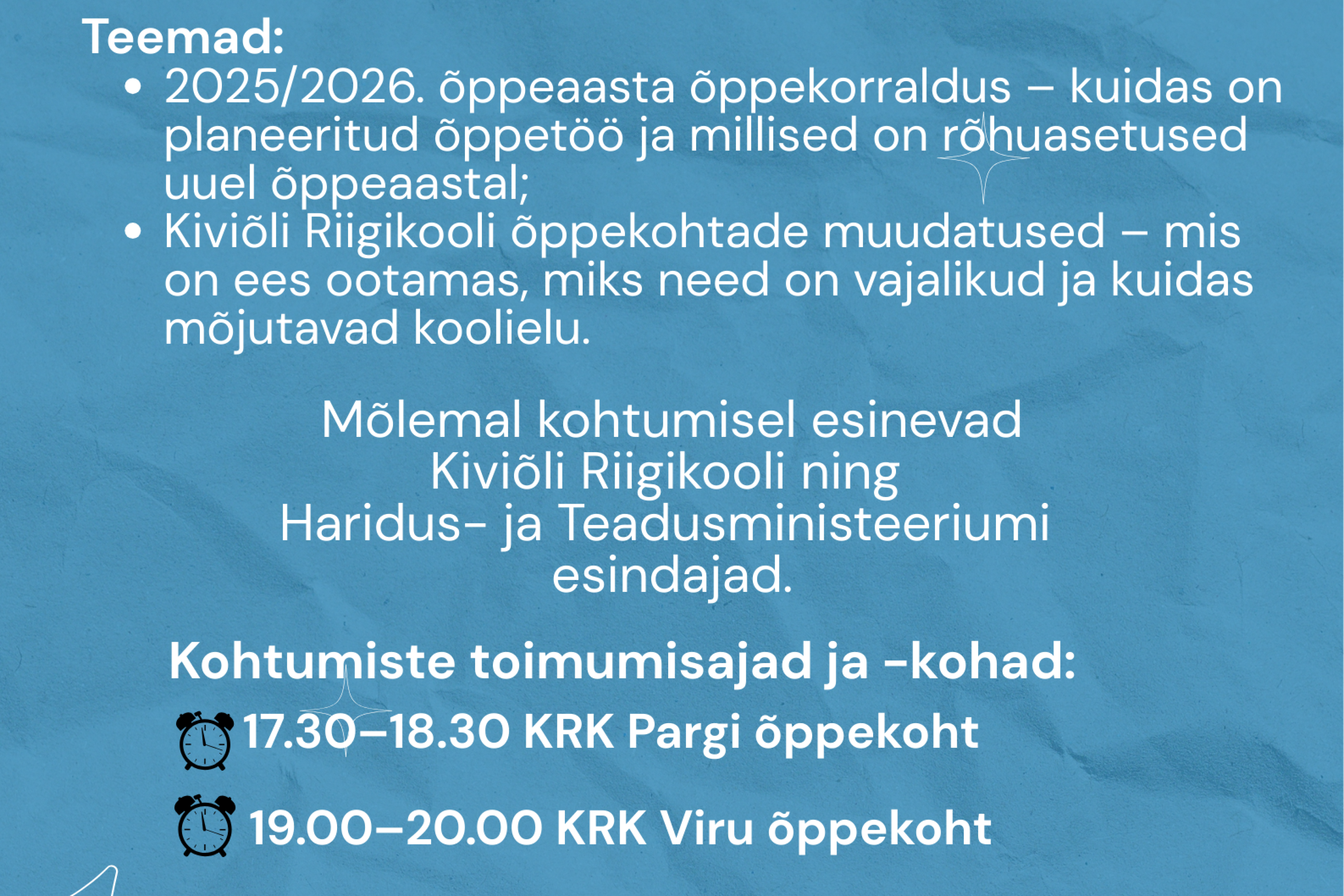 Mõlemal kohtumisel esinevad Kiviõli Riigikooli ja Haridus- ja Teadusministeeriumi esindajad.
